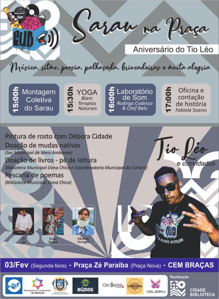 O ‘Sarau na Praça’ reúne múltiplas manifestações culturais para a população e turistas de Búzios. Atualizado em 27/01.