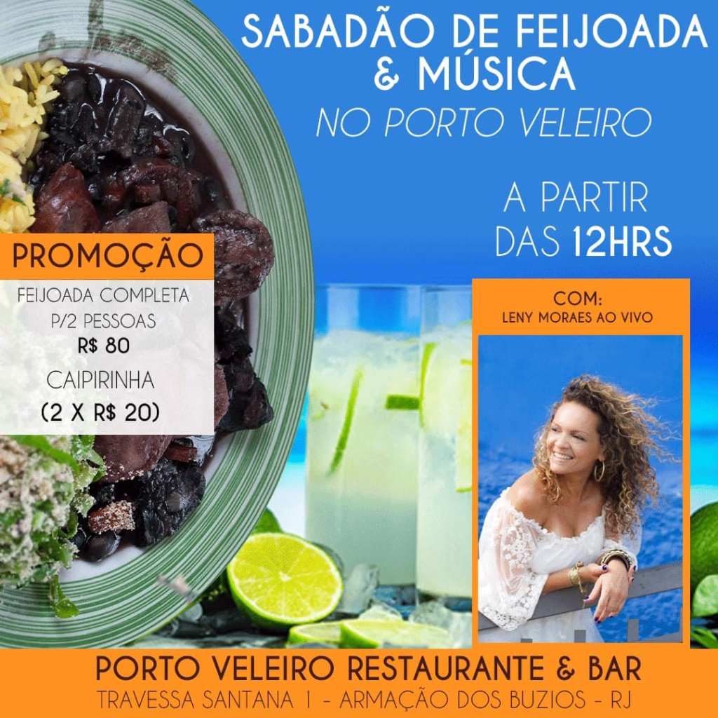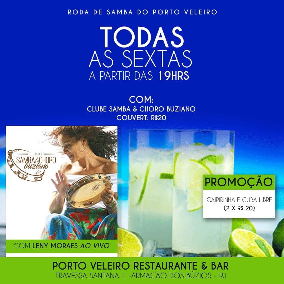 O Porto Veleiro Bar e Restaurante reabriu a temporada de samba, todas as sextas a animação fica por conta da roda de samba com Leny Moraes acompanhada pelo Clube Samba e Choro Buziano. E aos sábados, a atração é a elogiada feijoada ao som de Leny Moraes com Renato Arpoador com muito samba e MPB.