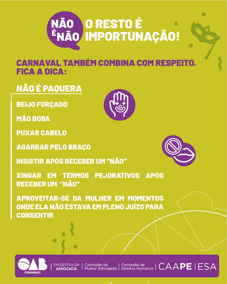 A campanha não é específica para o Carnaval, o coletivo atua durante o ano todo, realizam palestras e fazem ações pontuais, sendo que no Carnaval a campanha ganha uma ação de distribuição de tatuagens temporárias com os dizeres ‘Não é Não’.