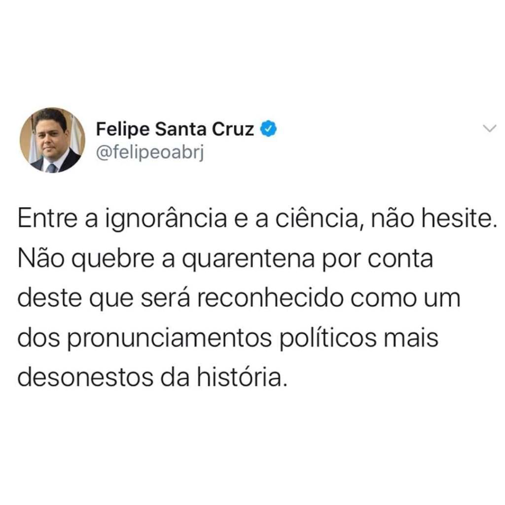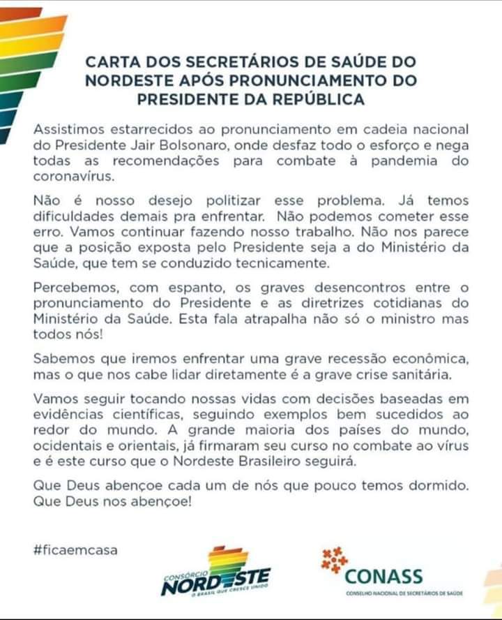 Em um discurso alienado e irresponsável, para não dizer genocida, em cadeia nacional, na noite do dia 24 de março, o presidente Jair Bolsonaro vai contra todas as recomendações da OMS, médicos, cientistas e pesquisadores do Brasil e do mundo. Ressaltando que “escolas devem abrir”, e as pessoas tem que voltar às suas rotinas, contrariando inclusive o Ministro da Saúde Henrique Mandetta.