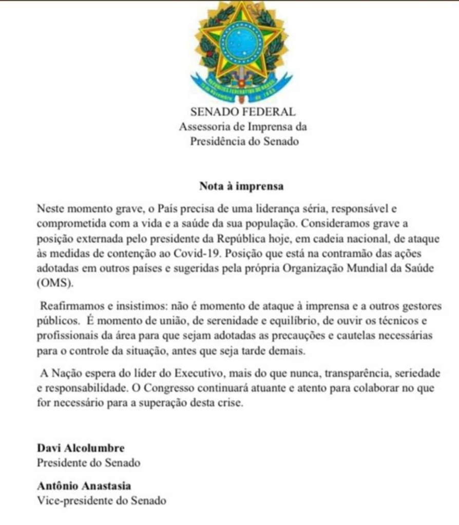 A imprensa também foi alvo de ataque, o presidente alegou que tem sido ‘alarmista’. Contudo, para especialistas e população em geral, a imprensa, tanto a grande quanto as pequenas ou independentes, tem tido um papel fundamental em informar. Após a prevenção, a informação tem sido a principal aliada contra a pandemia. Sem a imprensa atuando como vem fazendo, certamente os casos no Brasil estariam superiores aos atuais 46 mortos e 2.201 casos confirmados (dados do dia 24/03).