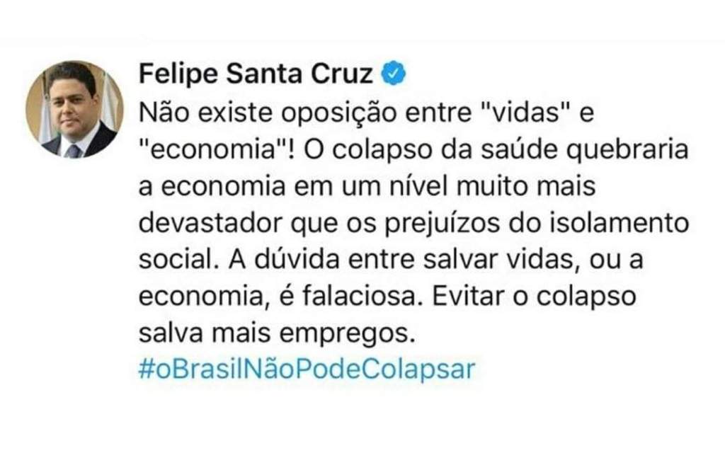 No final das contas, a sensatez parece prevalecer na maior parte do Brasil, não por influência do presidente, mas dos demais. Em recentes declarações, o Ministro da Saúde Henrique Mandetta e até mesmo o vice-presidente Hamilton Mourão afirmam que o governo está seguindo recomendações OMS (Organização Mundial da Saúde) e não do presidente. Governadores, a grande maioria, também ressaltam a importância de se seguir os protocolos internacionais de autoridades da Saúde. Ministério Público, OAB, entre outras entidades representativas da sociedade também estimulam o seguimento dos protocolos internacionais.