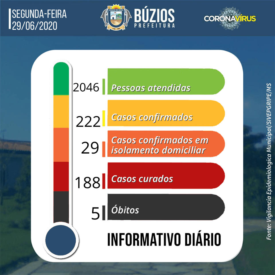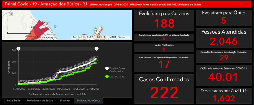 Na manhã de 29 de junho, o Painel Covid da prefeitura de Búzios informava 222 casos confirmados na contagem geral.