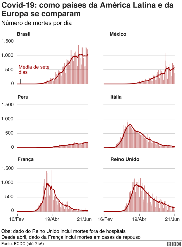 A diferença do Brasil para outros países é que ao atingir o auge de mortos e contaminados diários, o Brasil permanece com a mesma média, criando uma espécie de platô no gráfico. Enquanto em países europeus, por exemplo, a média diária começou a baixar ao atingir o pico da pandemia.