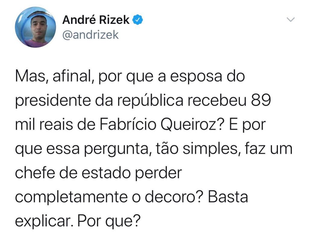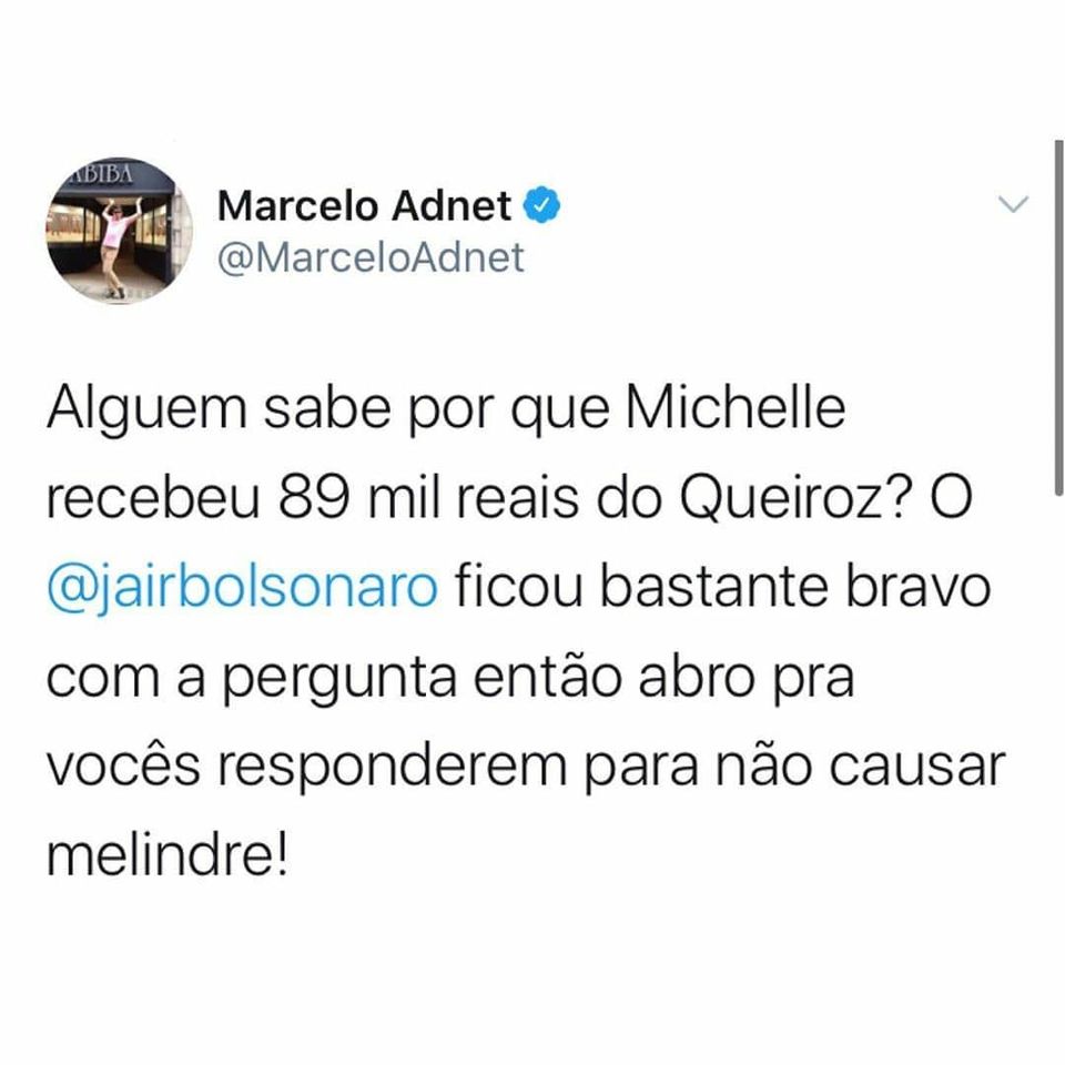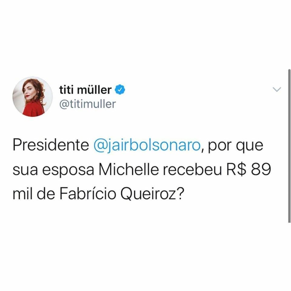 Mais de dois mil ‘twittes’ por minuto foram postados com a pergunta “Presidente Jair Bolsonaro, por que sua esposa Michelle recebeu R$ 89 mil de Fabrício Queiroz?”. Já passam de dois milhões de postagens com a pergunta, de interesse público, e que deixa Bolsonaro tão descontrolado. Famosos e influenciadores, além de usuários da rede publicaram a pergunta que todos nós queremos saber a resposta.