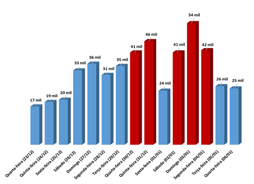 De acordo com a CCR ViaLagos, concessionária que administra a principal via de acesso para a Região dos Lagos, a previsão é de mais de 400 mil veículos, entre os dias 27/12 e 06/01, sendo os dias 30 e 31 de dezembro os mais movimentados para a Região, quando deverão passar 41 e 46 mil veículos, respectivamente (veja o gráfico).