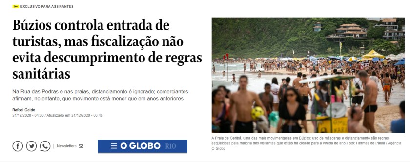 Na edição do dia 31 de dezembro d’O Globo, a matéria ‘Numa Búzios lotada, máscara é peça rara’, retrata fielmente o que está acontecendo no Município. Um descontrole generalizado.