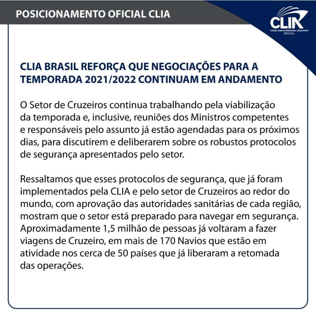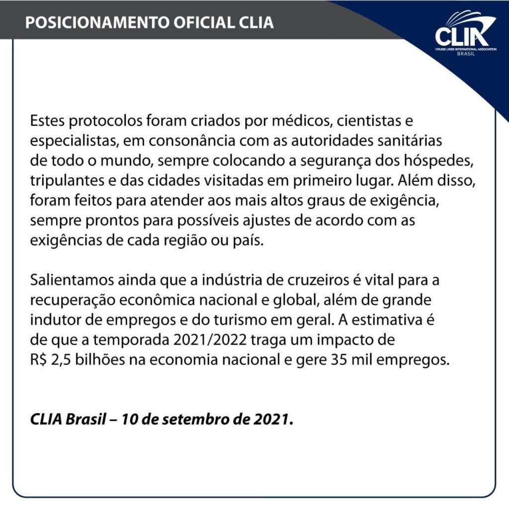 A Associação Brasileira de Cruzeiros Marítimos se manifesta no mesmo dia (10/09). Veja: