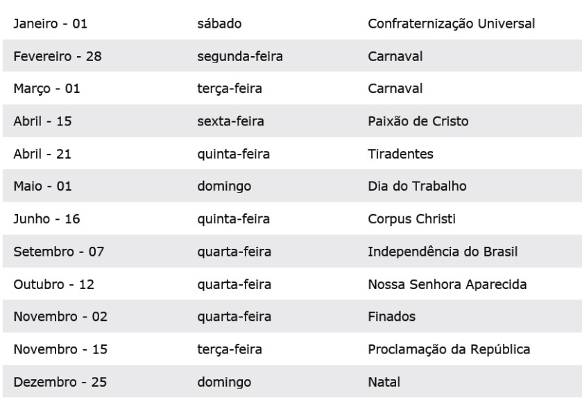 Confira a tabela de feriados nacionais, vale lembrar que alguns dos feriados prolongados são pontos facultativos, como o Carnaval (segunda-feira) e Corpus Christi (quinta-feira).