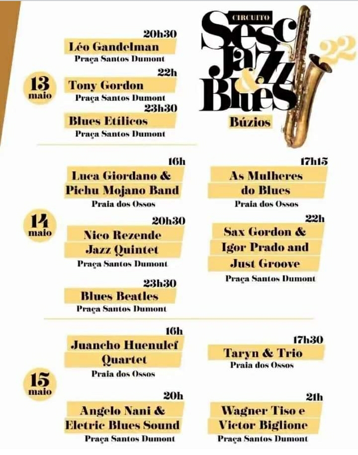 O Circuito Sesc de Jazz & Blues será aberto no dia 13 de maio em Búzios. Serão 10 shows reunindo nomes como saxofonista americano Sax Gordon & Igor Prado and Just Groove, Léo Gandelman, Tony Gordon, Nico Rezende Jazz Quintet, Wagner Tiso, Victor Biglione entre outras atrações.