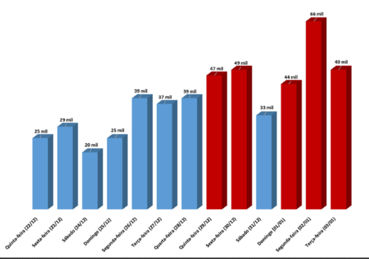 Para o período da semana de ano novo, a estimativa é de 360 mil veículos, entre os dias 27 de dezembro até 03 de janeiro. Quinta e sexta que antecipam o Réveillon são esperados 46 e 49 mil veículos e na volta 66 mil veículos, entre segunda e terça (03).