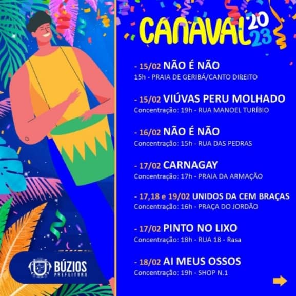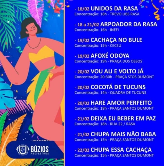 De acordo com informações da prefeitura de Búzios, 17 blocos farão seus desfiles por diversos bairros da Cidade. Ainda de acordo com a prefeitura, a Secretaria de Turismo estará apoiando os desfiles.