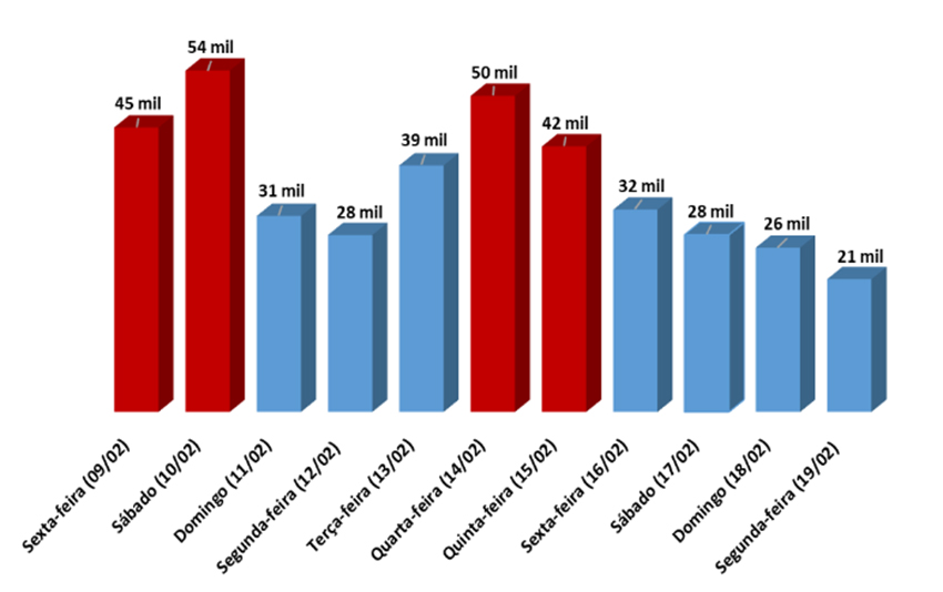 sexta-feira (09) e sábado (10), de acordo com a concessionária, serão os dias de maior fluxo no sentido Costa do Sol, previsão de 45 e 54 mil veículos, respectivamente. Já para a volta do Carnaval, quarta-feira (14) e quinta-feira (15), o fluxo volta a ter maior intensidade, com previsão de 50 e 42 mil veículos, respectivamente.