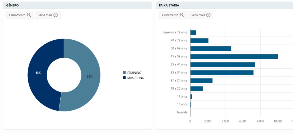 O eleitorado feminino conta tem a maioria dos votos, são 18.900 mulheres aptas a votar, contra 17.242 homens, vale lembrar que também tem 13 eleitoras e eleitores que usam nomes sociais e estão aptos ao voto.