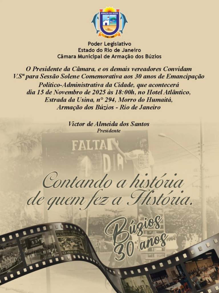 No dia 15 de novembro (sábado), a Câmara Municipal de Armação dos Búzios realiza a Sessão Solene, em comemoração aos 30 anos de emancipação político-administrativa da cidade.